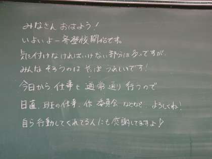 いよいよ始まります。全校一斉登校!給食も昼休みも部活動もあります。ワクワクしますが、感染防止の対策もしっかりやっていきます!