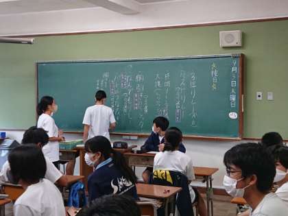 本日の5時間目は、学級活動の時間でした。1年生は、班のメンバーで協力しての双六づくり、2年生は、主に合唱コンクールに向けた取組、3年生は、運動会の選手決めを行っていました。どのクラスも楽しそうでした。