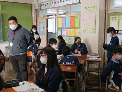本日、1年生の英語で公開授業がありました。自分で選んだ人物等の画像を持ち、それを英語で紹介するという授業でした。アイドル歌手やアニメのキャラクターなど様々な英語での紹介がありました。これまでの学習を生かして英語で紹介する姿は、みんなイキイキとしていました。