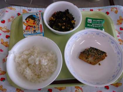 ・牛乳・ごはん・さばのごまじょうゆ焼き・大豆の磯煮・ふりかけ