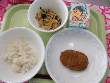 今日のハンバーグは既製品ですが、給食室でしょうゆ煮にしました。煮るという手間で、甘辛い和風のハンバーグに仕上がります。ご飯も進み、よく食べました。