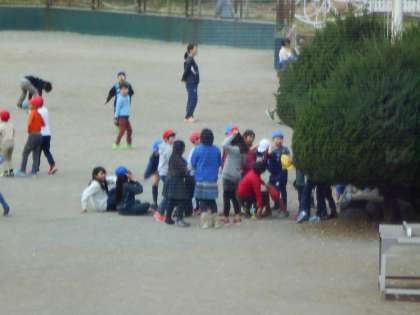 今日の昼休みは、ふれあいタイムの縦割り班遊びでした。上級生が下級生達を上手にリードし、運動場いっぱいにが広がって楽しく遊びました。曇り空の下、今にも雨が降り出しそうなお天気でしたが、ロング昼休みの時間いっぱい、こどもたちは大きな声を響かせながら、元気いっぱいに遊んでいました。