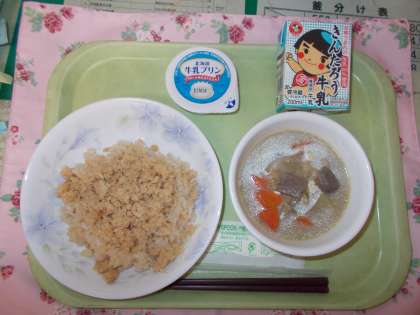 本日の給食 牛乳・鯛めし・豚汁・牛乳プリン