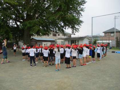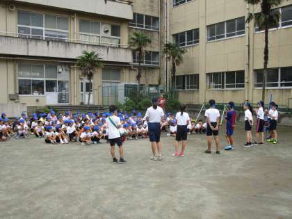 運動会に向けての全校の練習が始まりました。今朝は色ごとに運動場に集まり応援練習を行いました。応援団の自己紹介の後、応援の流れの説明があり、初めて全員で声を出しました。