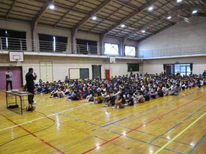 警察の方が不審者役に扮して、実際に校内に不審者が侵入したという想定で訓練を行いました。その後、体育館に集まり、学校の外で遊んでいるときや、登下校時に不審な人に会った場合にどうしたらよいかについて、お話を聞いたりビデオを見たりしました。
