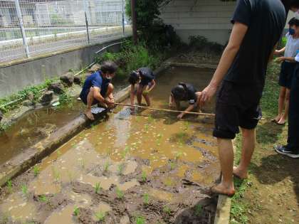 学校の水田に、稲の苗を植えました。暑い日でしたので、泥の中に裸足で入ったことが気持ちよかったようです。これから稲の生長を観察していきます。