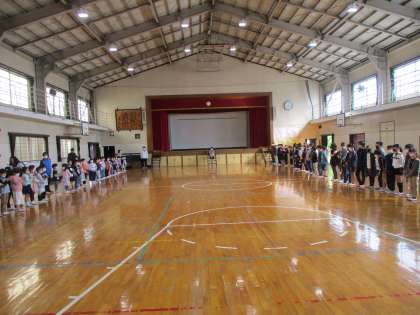 一年生と上級生の対面式は例年は全校児童が集まって行いますが、今年度は一年生と六年生が行いました。六年生が名前を呼んでペアを作り、プレゼントのメダルを渡していました。