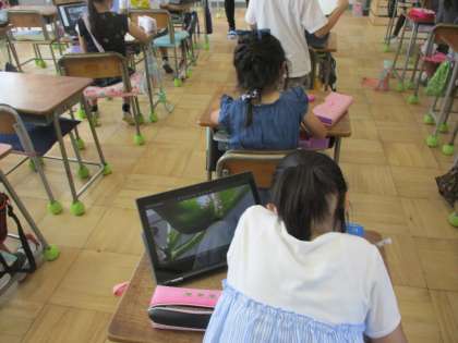 育てている野菜の苗の観察を行いました。クロームブックで写真を撮り、教室でその写真を見ながら、記録を書きました。画面を指で操作することで、写真を簡単に拡大表示することができます。畑で観察したことと合わせて、細かいところまで気が付き、記録することができました。