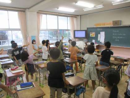 7月11日が開校記念日なので、今朝は酒匂小学校の歴史について、校長先生にお話をしていただきました。昨年に続いてクイズがあり、正解が発表されるたびに、教室から子どもたちの喜ぶ声や、悔しがる声が聞こえました。