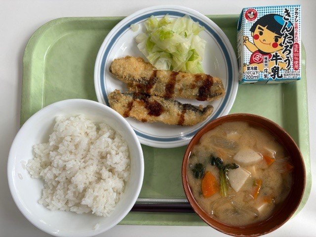 「小田原献立」 ごはん 小田原かますのフライ 茹でキャベツ 里芋のみそ汁 牛乳