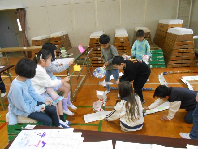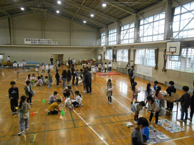 11月25日(火)の1・2校時に、2年生は、自分たちで作った手作りおもちゃを使っておもちゃランドを開き、1年生を招待しました。スタンプカードや地図も作り、それぞれのコーナーやお店に分かれて、やってきた1年生を出迎えます。やり方を説明したり、コツを教えたりしながら自分たちの作ったおもちゃで遊んでもらいました。笑顔で遊ぶ1年生を前に、2年生もにっこり!3年生にむけてよりたのもしい姿が見られました。
