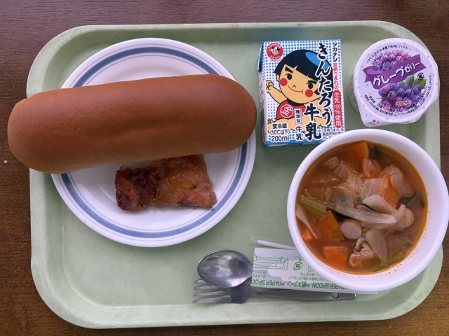 黒パン マーマレードチキン ごろごろ野菜スープ 牛乳 グレープゼリー