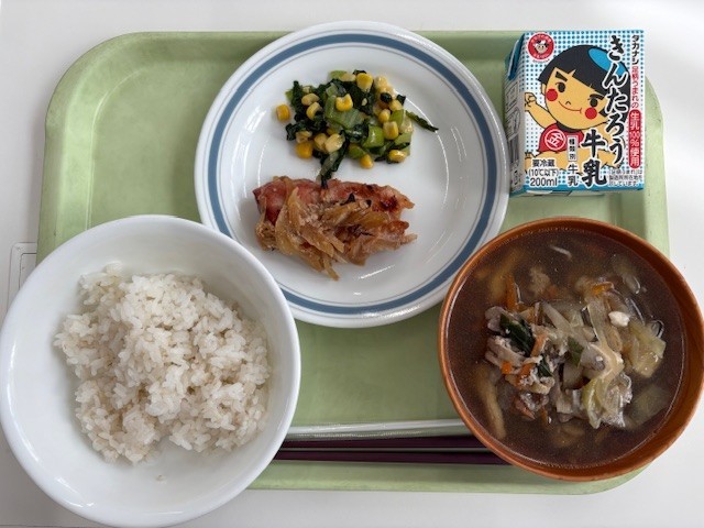 麦入りごはん 豚肉のオニオン焼き 青梗菜とコーンの炒め物 沢煮椀 牛乳
