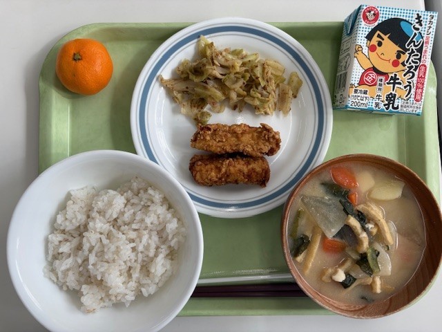 麦入りご飯 さばふぐの更紗揚げ きゃべつのおかか炒め みそ汁 牛乳 みかん