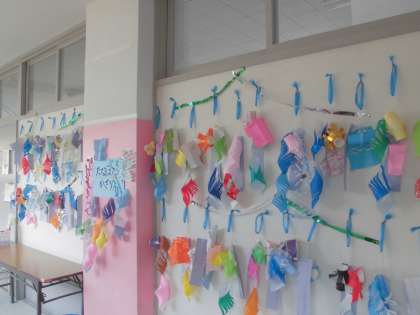 もうすぐ七夕です。先日の図工で作った「ちょきちょきかざり」の学習をさらに進めて、今回は七夕飾りを作りました。