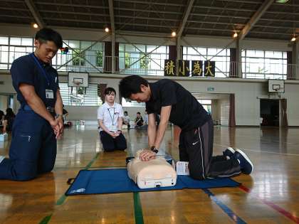 5月17日(木)に、これから行われるプール学習に向けて、救命法の講習会を職員で行いました。小田原消防栢山出張所の方を、お招きして心肺蘇生の方法や、AEDの使い方など学びました。