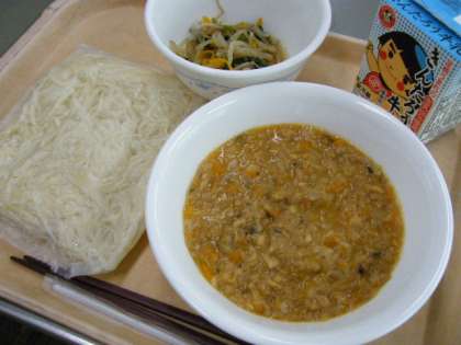 7月11日(水)の献立は、牛乳、ジャージャーめん、じゃこと野菜のごま炒めでした。