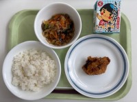 麦入りご飯 さばふぐの更紗揚げ きゃべつのおかか炒め みそ汁 牛乳 み...