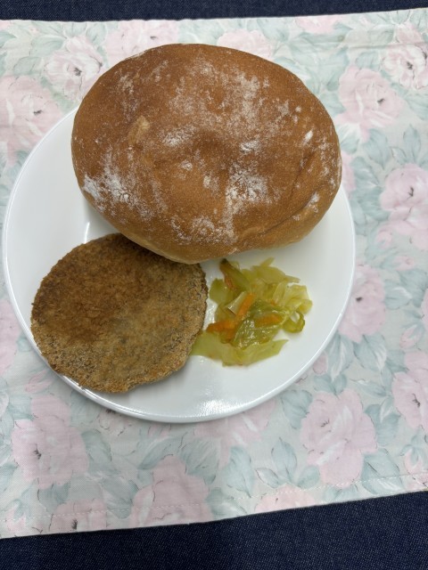 【今日の献立】ソフトフランスパン チキンメンチカツ キャベツソテー 豆乳シチュー 牛乳