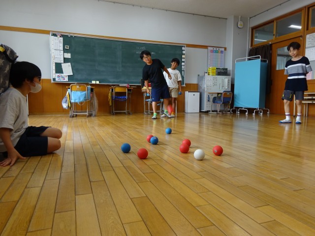 小田原市が主催する校外体験学習(スポレク)に向けて4年生以上でボッチャの練習も行っています。