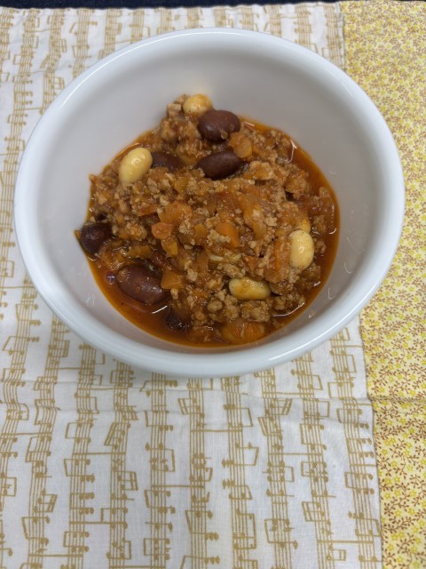 今日は「チリコンカン」。ひき肉、玉ねぎを炒め、インゲン豆や、トマト、チリパウダーなどの香辛料を炒めて煮込んだ主にメキシコが代表の料理でした。