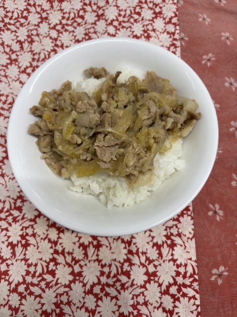 【今日の献立】 豚肉の生姜焼き丼 さつまいものみそ汁 牛乳