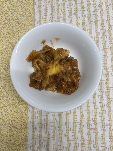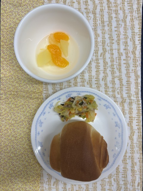 【今日の献立】 米粉ロールパン ラザニア キャベツとベーコンのソテー フルーツポンチ 牛乳