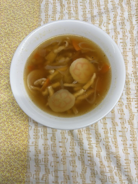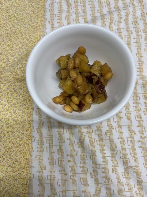 【今日の献立】 きつねうどん 大豆とさつまいもの揚げ煮 伊予柑ゼリー 牛乳