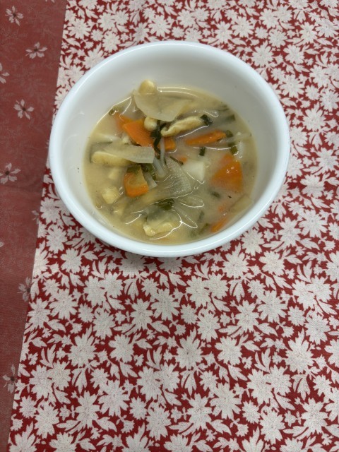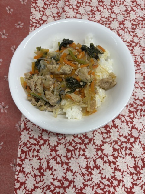 【今日の献立】 小松菜ぶた肉丼 小田原野菜のみそ汁 牛乳