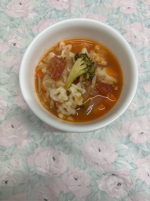 ミネストローネはイタリア発祥の野菜をたっぷり具沢山で栄養価も高く、体が温まるスープです。そこでクイズです!「玉ねぎ」は使われているでしょうか?答えは「はい、使っています」です。その他、にんにく、にんじん、トマト、ブロッコリー、米粉マカロニ、ベーコンが入っています。