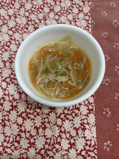 ビーフンが生まれた場所は中国です。アジアで広く親しまれている食べ物です。野菜との相性が良く、今日のビーフンスープには青チンゲン菜、にんじん、もやしが使われています。