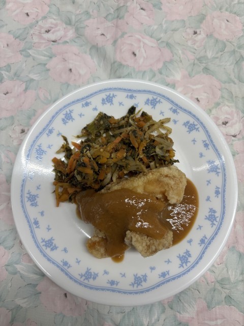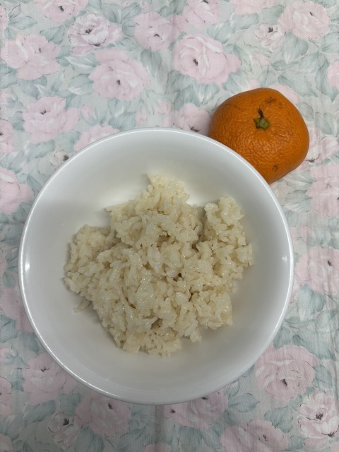 【今日の献立】 鶏肉の梅みそだれ さくら飯 小松菜のおかか炒め みかん 牛乳