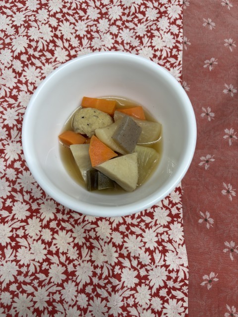 小田原のおでんの特徴は、小田原産のおでんの種を使う事です。今日の給食では、地魚入りはんぺんと、さといもが小田原産でした。あとは、梅味噌を添えるのが小田原おでんの特徴です。