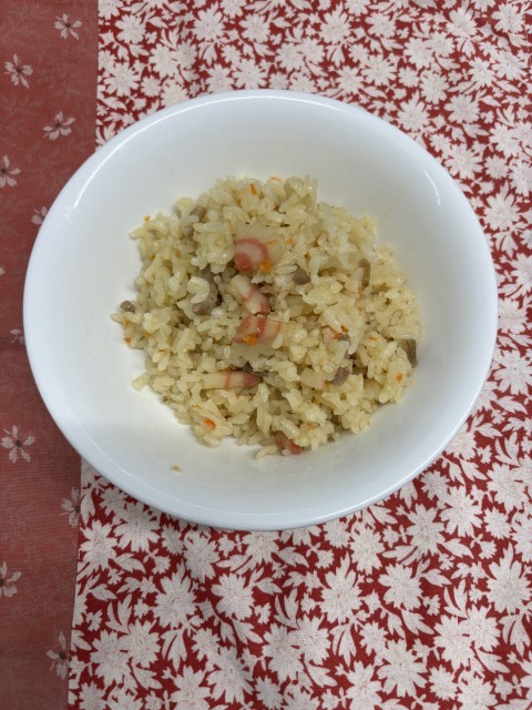 今日は給食週間でとったアンケートで、ごはんランキング1位の「炊き込みチャーハン」でした。ご飯を炒めたチャーハンではなく、アルファ化米を具材と一緒にスープで炊き込み、ごま油を効かせたチャーハンです。