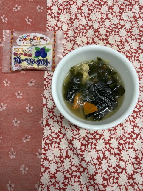 【今日の献立】 炊き込みチャーハン わかめスープ ブルーベリータルト 牛乳