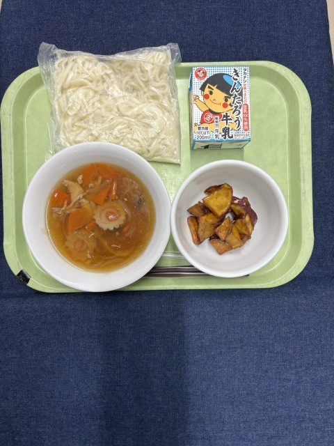 【今日の献立】 五目あんうどん さつまいものシナモン揚げ 牛乳