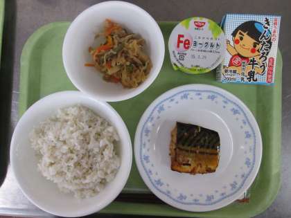 今日の献立は、 麦ご飯 鯖の香味焼き 切り干し大根 牛乳 鉄強化ヨーグルト です。