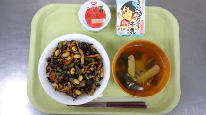 今日の献立は、 ひじきご飯 すまし汁 牛乳 りんごヨーグルト です。