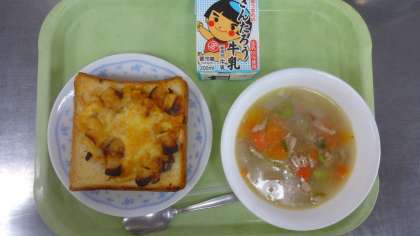 今日の献立は、かまぼこピザトースト(4年1組開発料理) スコッチブロス 牛乳 です。