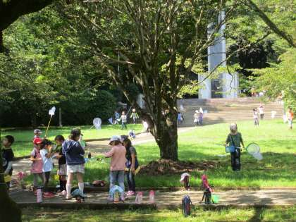 慰霊塔前の公園に出かけ、虫取りをしました。子どもたちは夢中になって探し、短い間にバッタ、ちょう、とかげなどたくさん捕まえることができました。