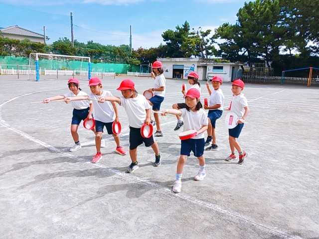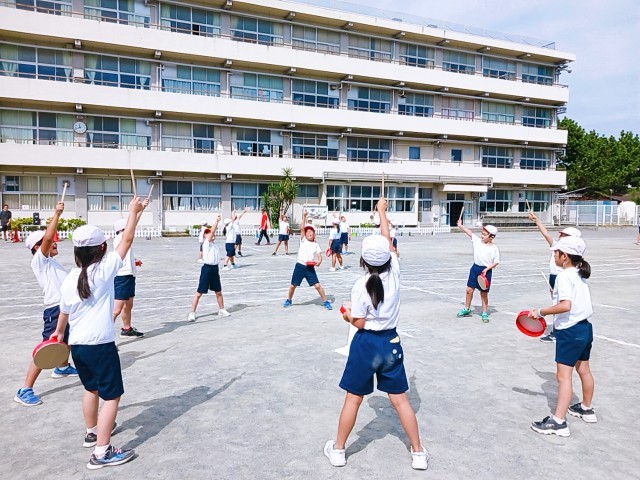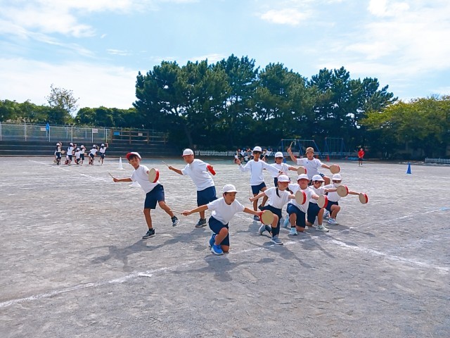 運動場での表現の練習が始まりました。一つ一つの動きが確実にできるようになった子供たちは、力強い演技を見せています。