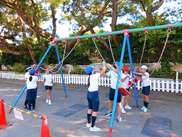児童の下校後、教職員で運動場の整備やライン引きを行いました。