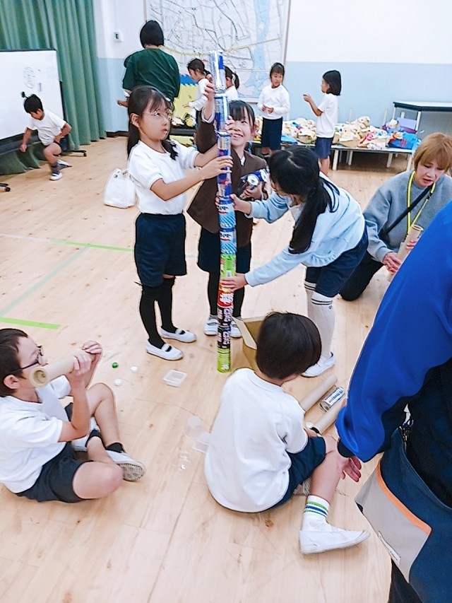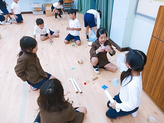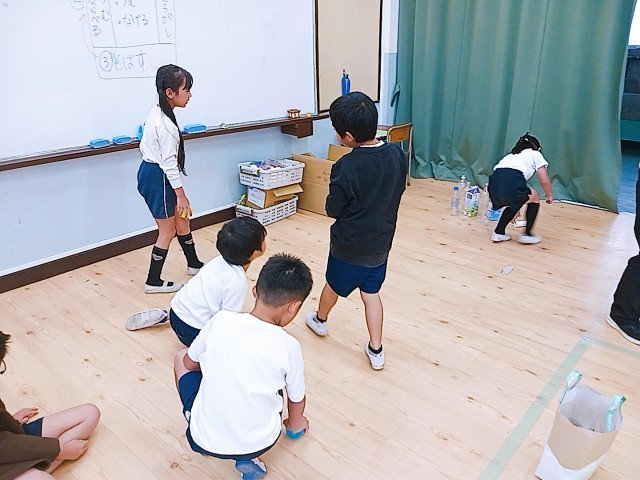 生活科「あそびランド」の学習の始まりです。身の回りにあるものを使って、転がす・積み上げる・投げるなどの遊びをしています。