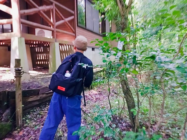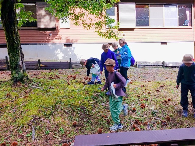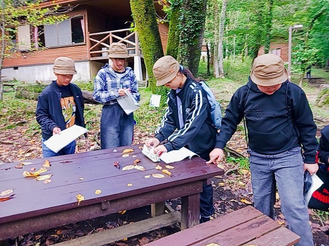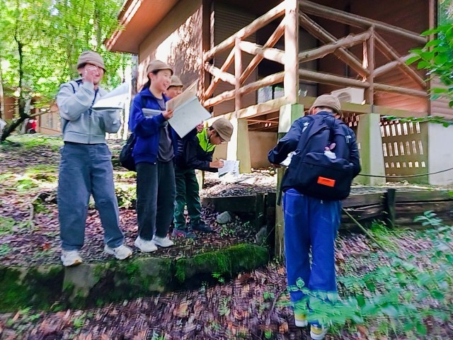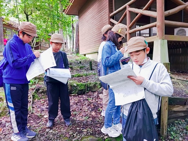 木に付けてある番号を見つけながら歩き、自然を感じる学習です。木をさわったり匂いをかいだり木の様子を観察します。