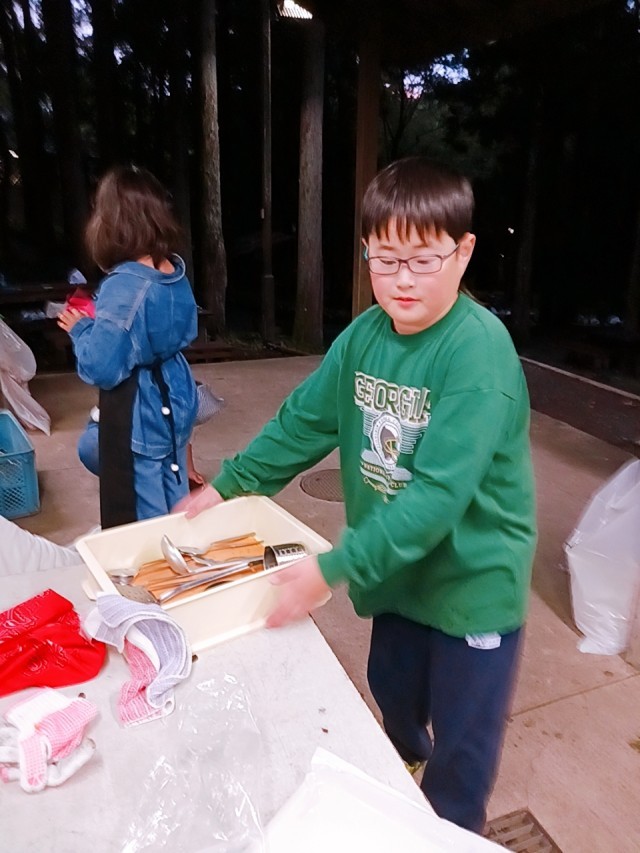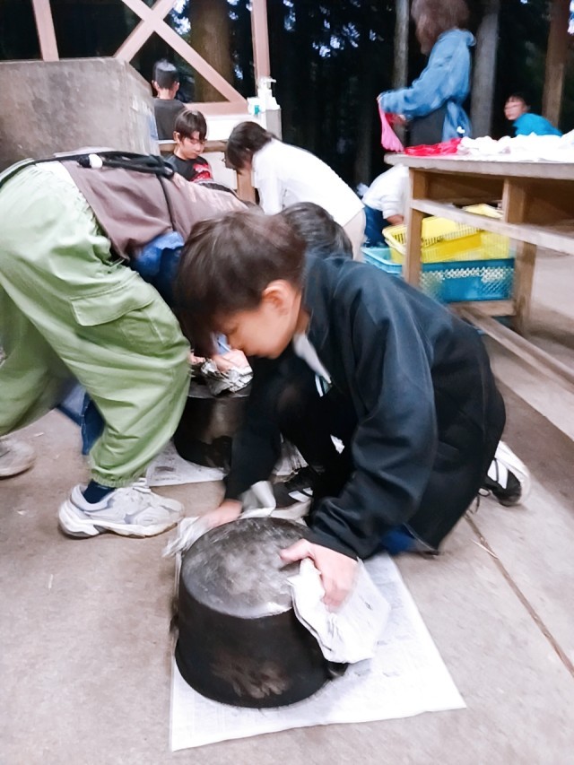 17時過ぎより片付けが始まりました。真っ黒になった鍋のすすを落とし、洗っています。かまどの灰の片付けも行いました。他のグループも手伝い、進んで取り組む様子が見られました。