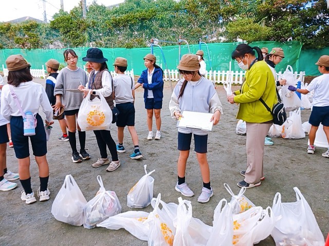 終了後はペア学年で挨拶をし、ごみを集めました。なかよし班の赤白青で分け、環境委員会の子供たちがごみの量を集計しています。