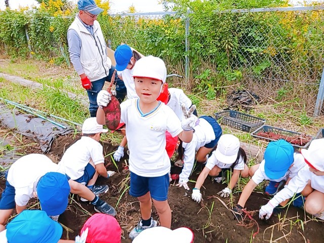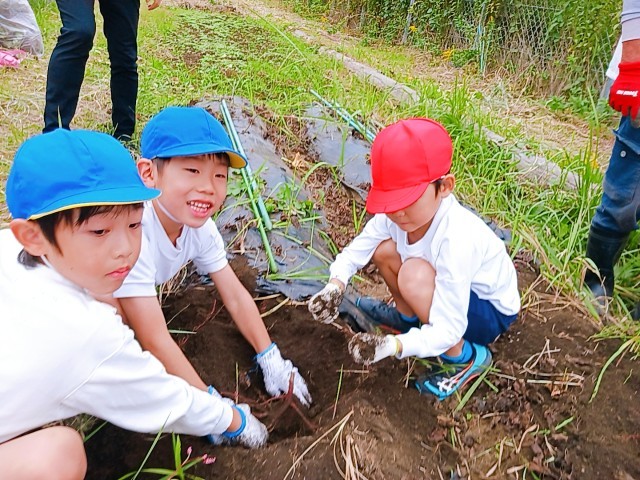 ほりかたを担任が説明しながら土を掘っていくと、大きなさつまいもが出てきました。子供たちは驚きと共に「よし、やるぞ。」と意欲満々です。