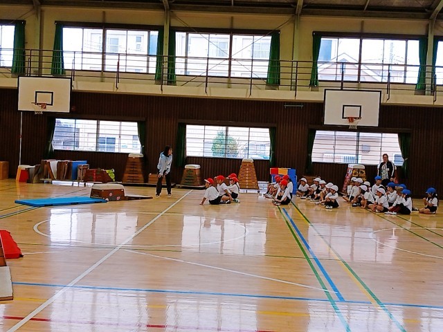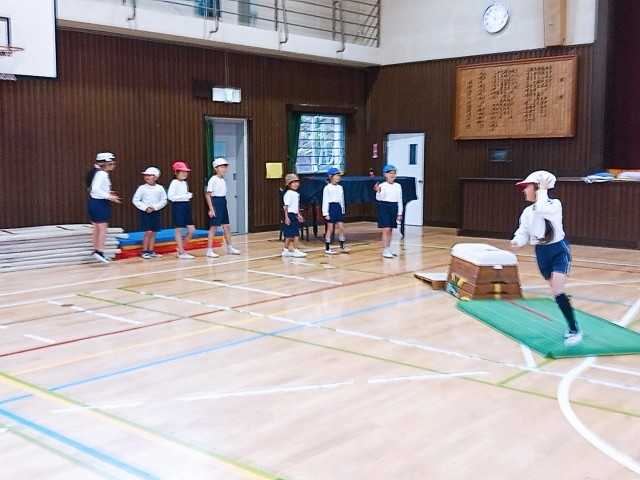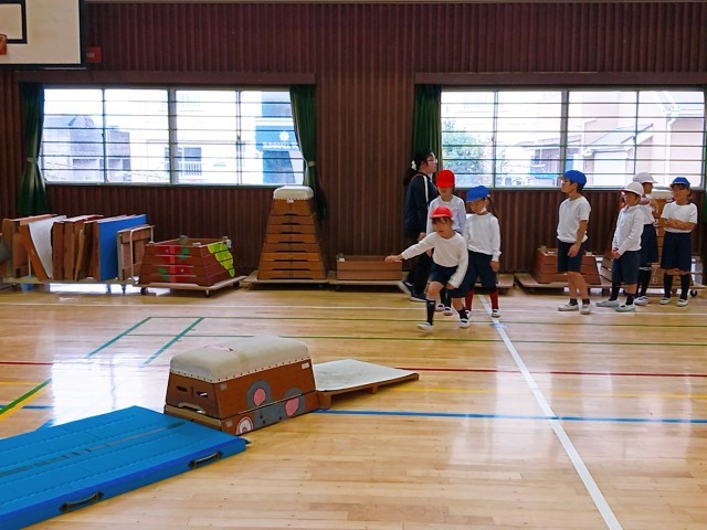 準備体操・うさぎ跳びで手のつきかたを練習しました。2段から4段の高さの跳び箱に挑戦しました。