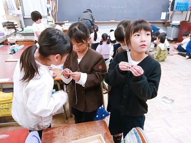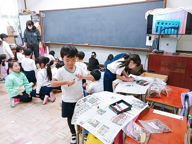 生活科の秋となかよしの学習です。先日、小田原東高校で拾ったどんぐりを使って、どんぐりごまやネックレスを作りました。
