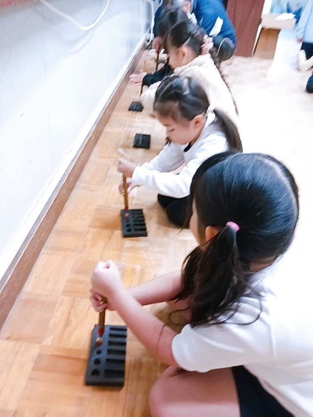 どんぐりゴマが上手に回ると笑顔がこぼれます。色付けも楽しそうに行っています。